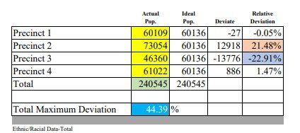 Summary: Precinct 1 is overpopulated by 364 (.016%), Precinct 2 is overpopulated by 12,787 (21.22%), Precinct 3 is underpopulated by 13,907 (23.08%) and Precinct 4 is overpopulated by 775 (1.25%). To determine whether or not the county is legally obligated to redraw boundaries, the threshold for local governmental entities should have no more than a 10% top to bottom deviation. Hays County is at 44.3% top to bottom. Therefore, the boundaries must be redrawn.